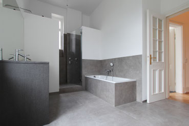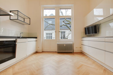Klassisch angeordnet, sind von der Diele alle Räume direkt zu begehen. Die große Wohnküche mit einem kleinen Balkon ist mit einer hochwertigen Einbauküche ausgestattet. Durch eine Flügeltür gelangen Sie in den Wohn-Essbereich. Zur Straßenfront befinden sich insgesamt drei Zimmer, die alle großzügig miteinander verbunden sind und sehr vielseitig genutzt werden können. In dem mittleren Wohnraum können Sie auf einen herrschaftlichen Balkon austreten. Auch die beiden weiteren angrenzenden Räume sind durch Flügeltüren verbunden und wären ideal als Schlafzimmer zu nutzen. Hier befindet sich ein weiterer Balkon/Erker. Neben dem Gäste-WC ist die Wohnung mit zwei weiteren sehr geschmackvollen, hochwertigen Bädern ausgestattet.
