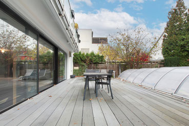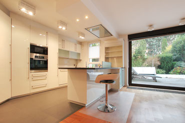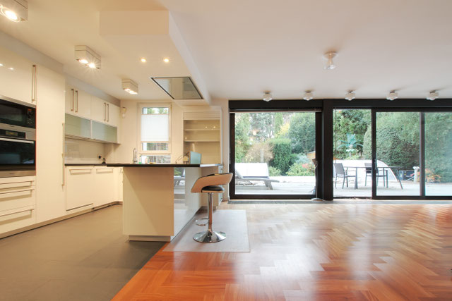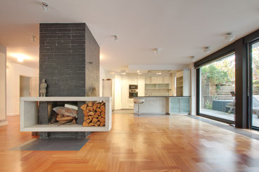 Klassisch angeordnet, sind von der Diele alle Räume direkt zu begehen. Die große Wohnküche mit einem kleinen Balkon ist mit einer hochwertigen Einbauküche ausgestattet. Durch eine Flügeltür gelangen Sie in den Wohn-Essbereich. Zur Straßenfront befinden sich insgesamt drei Zimmer, die alle großzügig miteinander verbunden sind und sehr vielseitig genutzt werden können. In dem mittleren Wohnraum können Sie auf einen herrschaftlichen Balkon austreten. Auch die beiden weiteren angrenzenden Räume sind durch Flügeltüren verbunden und wären ideal als Schlafzimmer zu nutzen. Hier befindet sich ein weiterer Balkon/Erker. Neben dem Gäste-WC ist die Wohnung mit zwei weiteren sehr geschmackvollen, hochwertigen Bädern ausgestattet.