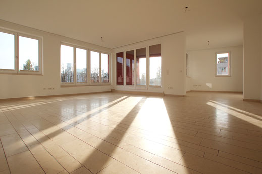 Helle, großzügige Räume mit hohen Decken und bodentiefen Fenstern eröffnen einen spektakulären Blick auf die Frankfurter Skyline. Edle Materialien, wie der feine Natursteinboden mit Fußbodenheizung, unterstreichen das anspruchsvolle Wohnambiente. Plissees im Wohnzimmer sowie elektrische Rollläden sorgen für ein angenehmes Ambiente.